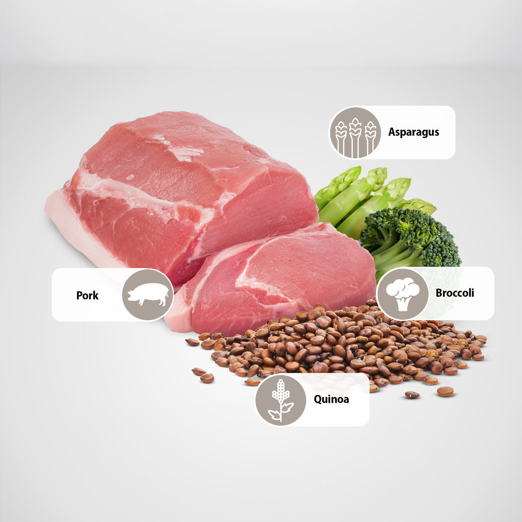 Lamb, hydrolyzed herring, quinoa seed, herring oil, broccoli, asparagus, fructooligosaccharides, calcium carbonate, psyllium seed husk, potassium chloride, vitamin A supplement, vitamin D3 supplement, vitamin E supplement, choline chloride, zinc methionine hydroxy analogue chelate, manganese methionine hydroxy analogue chelate, ferrous glycine complex, copper methionine hydroxy analogue chelate, DL-methionine, taurine, L-Carnitine.