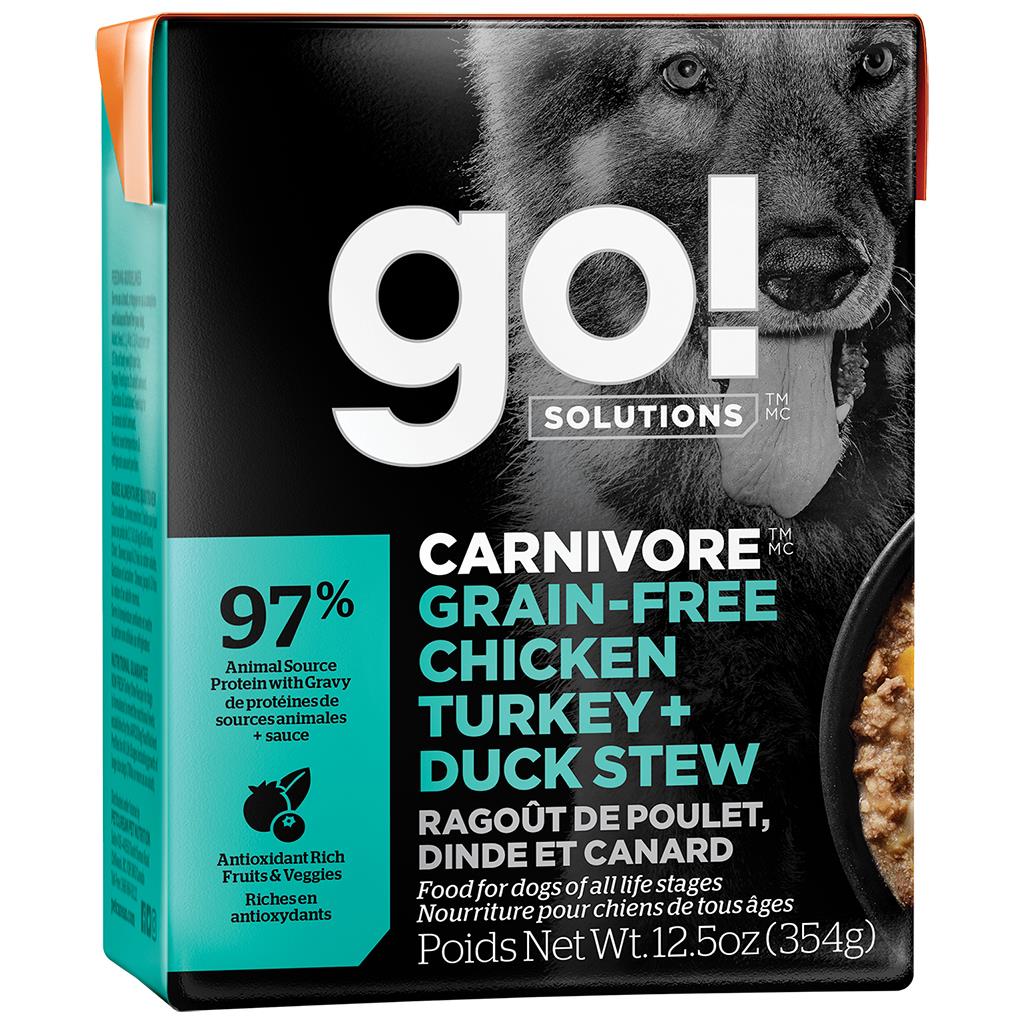 The Go! Carnivore Chicken, Turkey & Duck recipe is packed with drool-worthy animal proteins to support strong, lean muscles. This grain-free food provides complete and balanced nutrition to help your dog stay healthy & fit.