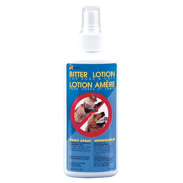Use Hagen Bitter Lotion for Dogs & Cats to to protect your furniture, carpets, doors, and more from unwanted gnawing or clawing, and to help prevent territorial marking by urination. This powerful taste deterrent also discourages fur biting and hair chewing, making it useful as a training aid. 200ml (6.7 oz) pump-spray bottle.