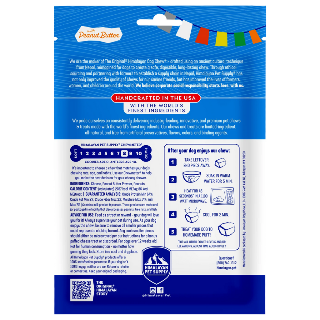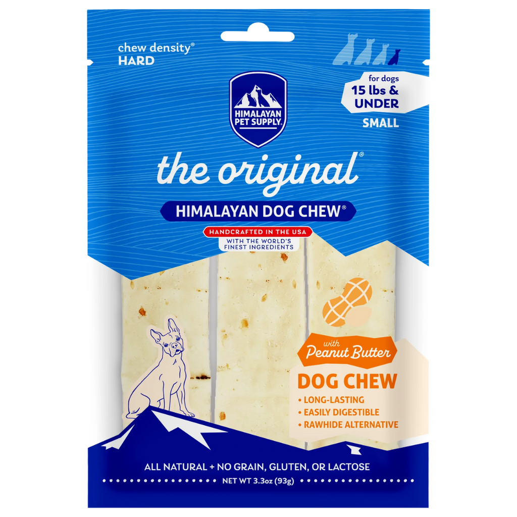 Himalayan Dog Chew Peanut Butter is the original, long-lasting, hard cheese chew that your dogs have come to know and love, simply with more flavor! Himalayan Dog Chew Peanut Butter flavored hard cheese chews are made using traditional Himalayan Cheese recipe with added bits of peanuts. These chews are naturally smoked and have no artificial flavors or binding ingredients.