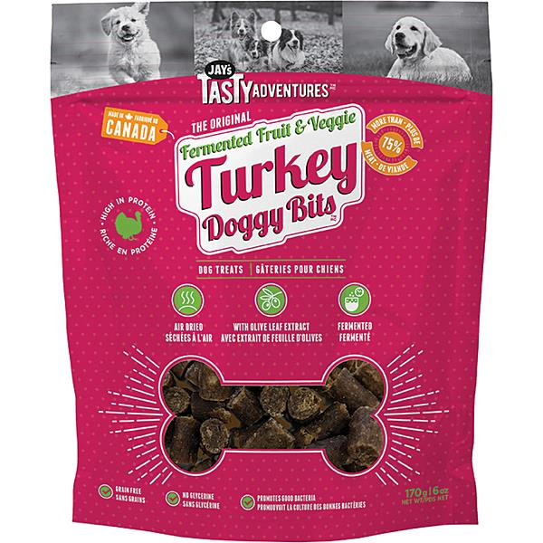 Jay's Fermented Fruit & Veggie Turkey Doggy Bits Treats boast a top-of-the-line blend of 75% fresh duck and nutrient-packed fermented fruit and veggies. They're delicately air-dried to preserve their natural goodness, with nothing artificial or glycerine added! Your pup will go wild for the satisfyingly soft meaty texture - something sure to make every tail wag uncontrollably.