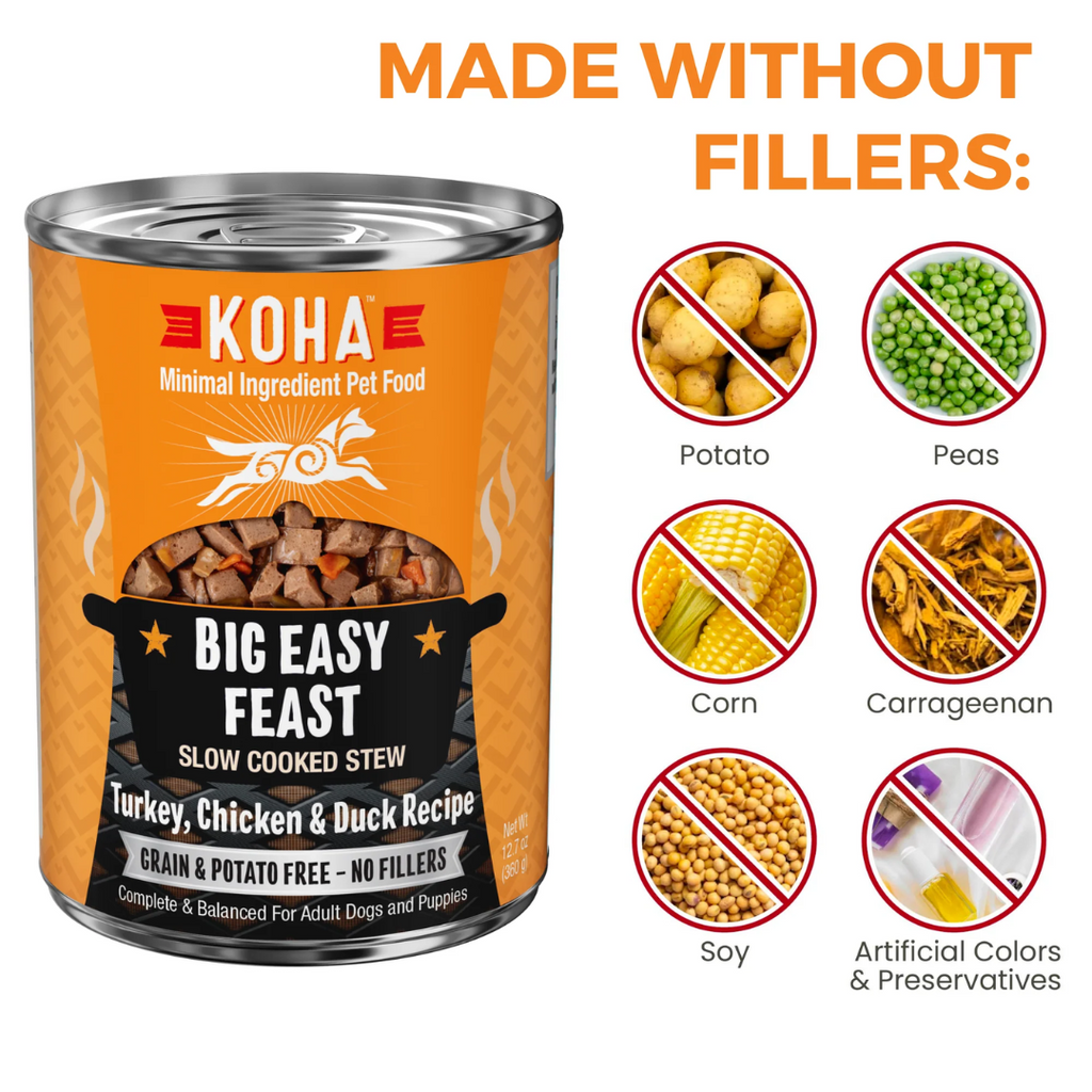 Make mealtime exciting with Koha Big Easy Feast Slow Cooked Stew. Bring the New Orleans party right to your dog's bowl with the delicious taste of turkey, chicken, and duck in a moisture rich stew. With no junky fillers like peas, potatoes, or corn that can lead to digestive issues, these slow cooked stews are easy to digest and ideal for picky eaters.