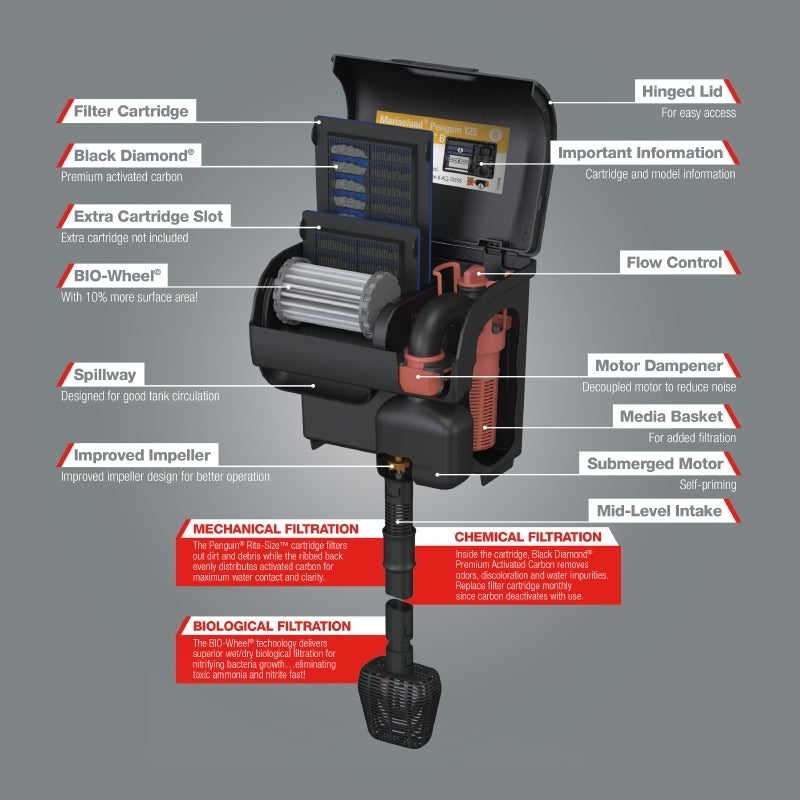 Marineland Penguin PRO Power Filter delivers easy, three-stage mechanical, chemical and biological aquarium filtration. This ultra-quiet filter has a decoupled motor to reduce noise so you can relax and enjoy your aquarium. This power filter contains BIO-Wheel technology to provide wet/dry biological filtration for nitrifying bacteria growth and eliminating toxic ammonia and nitrate fast. Uses Marineland Rite-Size B Filter Cartridge. Filters your 20-gallon aquarium six times per hour with flow control up to 125 GPH.