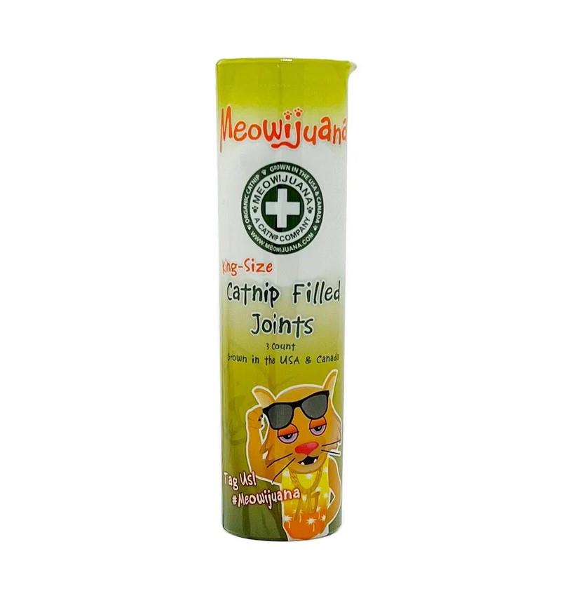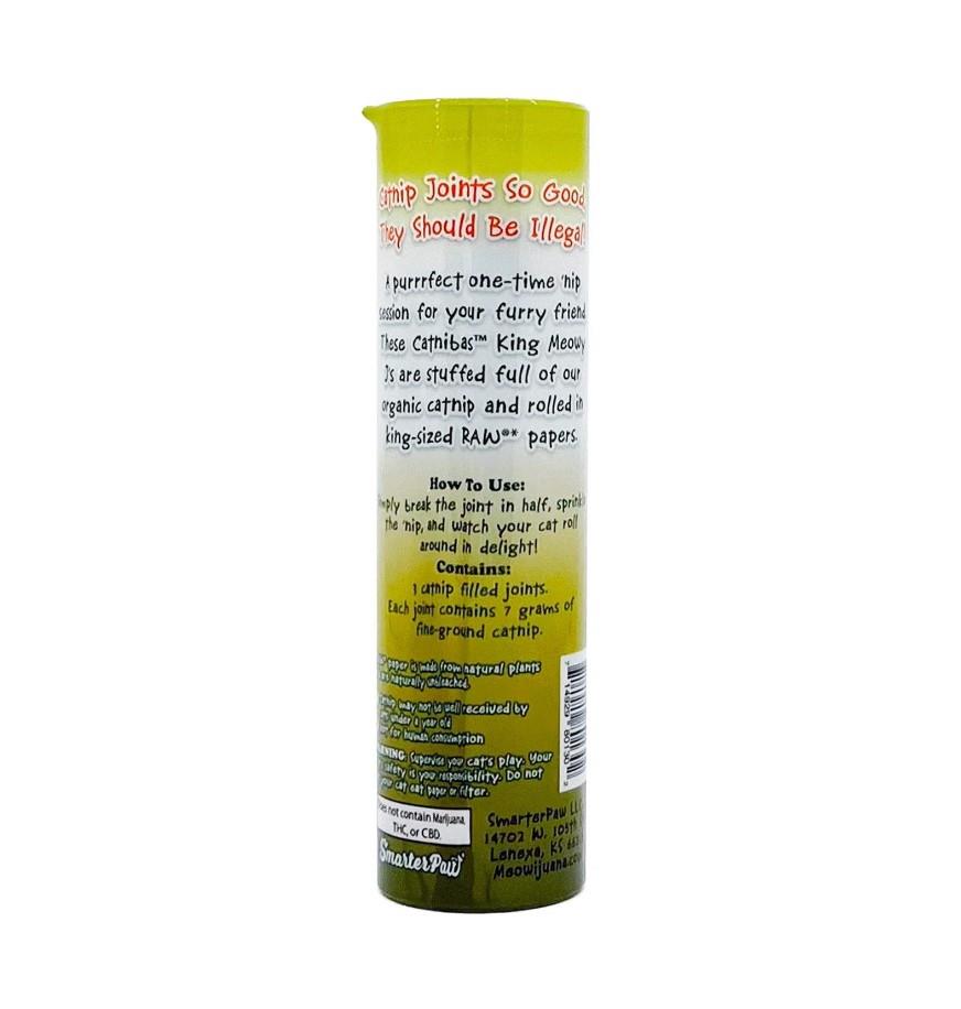 King Meowy J's Catnip Joints. Each joint contains 7 grams of fine-ground catnip.A purrrfect one-time nip session for your furry friend. These Catnibas™ King Meowy J’s are stuffed full of organic catnip and rolled in king sized RAW papers."