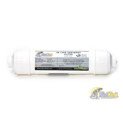 MistKing's 10 micron in line sediment filter runs in the tubing between the pump and the reservoir in order to stop dirt and other debris being spread through and blocking the nozzles and systems. Also decreases likelihood of spraying the enclosure with debris. Comes complete with fittings that take 1/4" tubing. Always gravity feed.