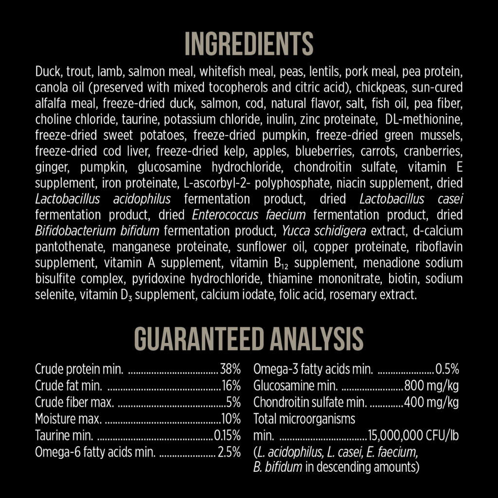 Duck, trout, lamb, salmon meal, whitefish meal, peas, lentils, pork meal, pea protein, canola oil (preserved with mixed tocopherols and citric acid), chickpeas, sun-cured alfalfa meal, freeze-dried duck, salmon, cod, natural flavor, salt, fish oil, pea fiber, choline chloride, taurine, potassium chloride, inulin, zinc proteinate, DL methionine, freeze- dried sweet potatoes, freeze-dried pumpkin, freeze-dried green mussels, freeze-dried cod liver, freeze-dried kelp, apples, blueberries, carrots, cranberries, ginger, pumpkin, glucosamine hydrochloride, chondroitin sulfate, vitamin E supplement, iron proteinate, L-ascorbyl-2-polyphosphate, niacin supplement, dried Lactobacillus acidophilus fermentation product, dried Lactobacillus casei fermentation product, dried Enterococcus faecium fermentation product, dried Bifidobacterium bifidum fermentation product, Yucca schidigera extract, d-calcium pantothenate, manganese proteinate, sunflower oil, copper proteinate, riboflavin supplement, vitamin A supplement, vitamin B12 supplement, menadione sodium bisulfite complex, pyridoxine hydrochloride, thiamine mononitrate, biotin, sodium selenite, vitamin D3 supplement, calcium iodate, folic acid, rosemary extract.