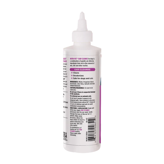Nutri-Vet Ear Cleanse for Dogs helps calm ear discomfort with soothing ingredients that encourage the shedding of dead skin cells, without irritating already sensitive ears. Ear Cleanse is made with Aloe Vera and salicylic acid.