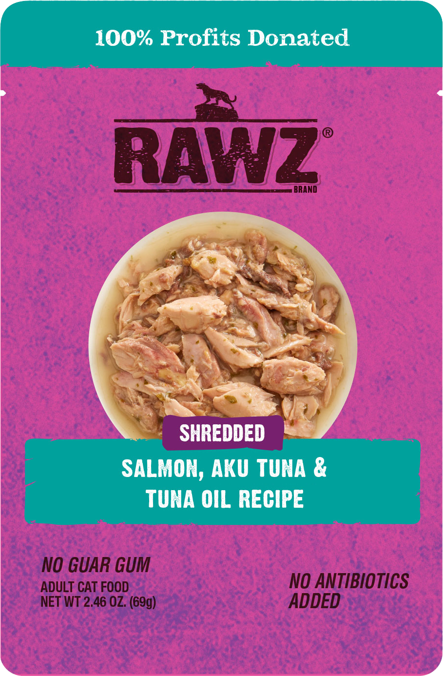 Featuring real Salmon as the first ingredient, this pouch features no gums, antibiotics or BPA-lining! This food can be fed as a complete meal. Like all Rawz products, 100% of the profits are donated!