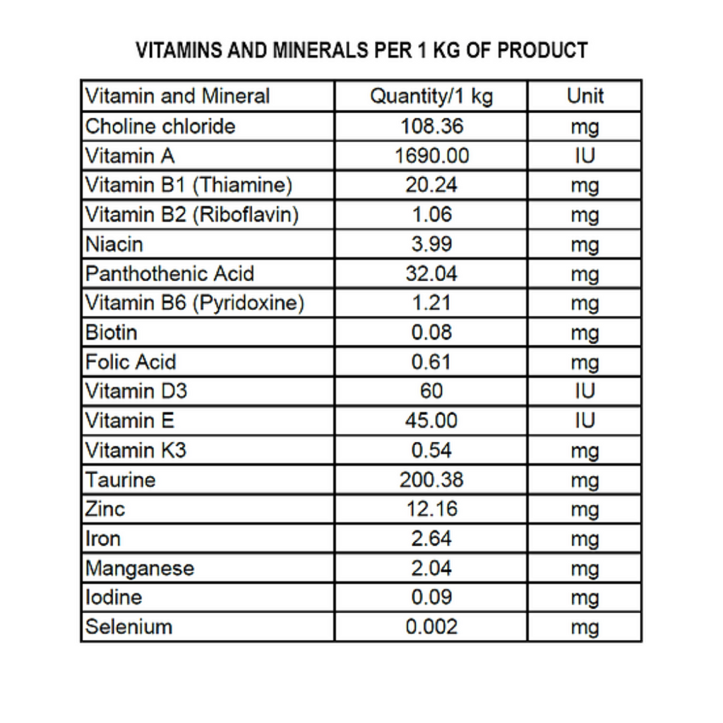 Crude Protein 12%, Crude Fat 1.5%, Crude Fiber 1%, Salt 1%.