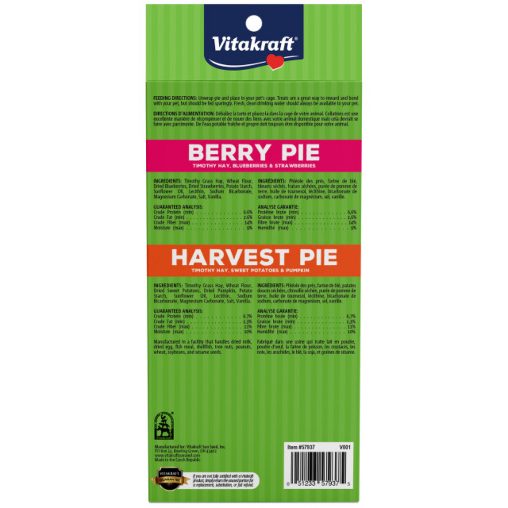 Treat your small pet to the special reward that is literally "cute as pie" with Vitakraft Berry Pie & Harvest Pie treats! Made for pet rabbits, guinea pigs, and hamsters, this delicious snack provides high-fiber hay and nutritious dried fruits & vegetables-all in a premium bakery crust that is ideal for nibbling.