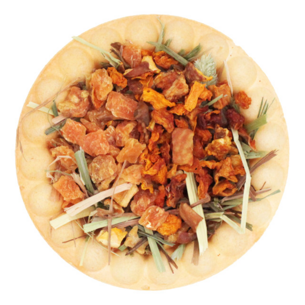 BERRY PIE: Timothy Grass Hay, Wheat Flour, Dried Blueberries, Dried Strawberries, Potato Starch, Sunflower Oil, Lecithin, Sodium Bicarbonate, Magnesium Carbonate, Salt, Vanilla. HARVEST PIE: Timothy Grass Hay, Wheat Flour, Dried Sweet Potatoes, Dried Pumpkin, Potato Starch, Sunflower Oil, Lecithin, Sodium Bicarbonate, Magnesium Carbonate, Salt, Vanilla.
