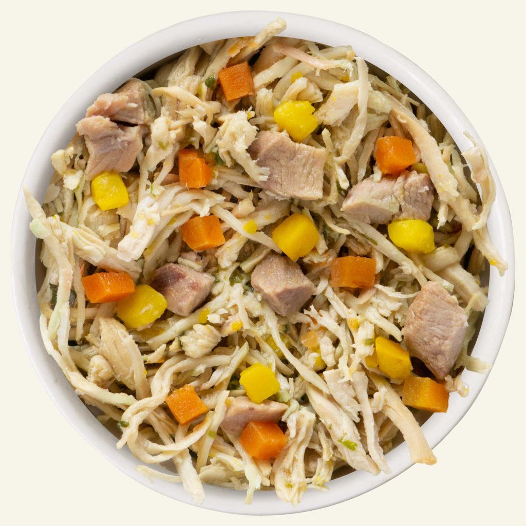 Chicken (Boneless, Skinless Breast), Chicken Broth, Duck, Pumpkin, Carrot, Spinach, Potato Starch, Sunflower Seed Oil, Tricalcium Phosphate, Xanthan Gum, Choline Chloride, Zinc Sulfate, Vitamin E Supplement, Ferrous Sulfate, Thiamine Mononitrate (Vitamin B1), Nicotinic Acid (Vitamin B3), Calcium Pantothenate, Vitamin A Supplement, Potassium Iodide, Manganese Sulfate, Copper Sulfate, Riboflavin Supplement (Vitamin B2), Pyridoxine Hydrochloride (Vitamin B6), Folic Acid, Vitamin D3 Supplement, Vitamin B12 Supplement